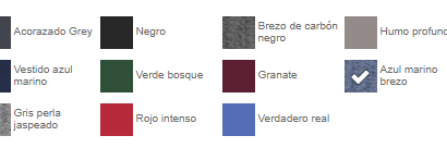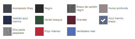 | color | Negro, Acorazado Grey, Azul marino brezo, Brezo de carbón negro, Granate, Gris perla brezo, Humo profundo, Rojo intenso, Verdadero real, Verde bosque, Vestido Azul Marino |